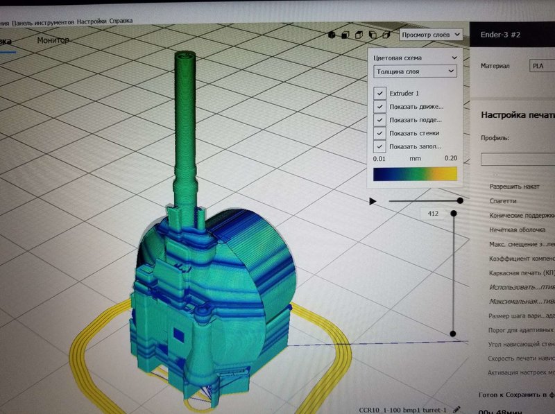 На FDM подобные вещи плохо печатаются. Если очень хочется на FDM, то сначала попробуйте напечатать из натурального АБС (этот пластик даёт на FDM максимальное качество печати мелочёвки и художки). Из ПЛА оно всегда будет оплывать, как не дуй (для мелочёвки ПЛА неподходящий материал). Если не получится из АБС, то можно напечатать ствол отдельно и приклеить к башне. Печатать можно несколько стволов рядом вертикально, либо один ствол горизонтально. Но всё это мазохизм, конечно, на FDM ..