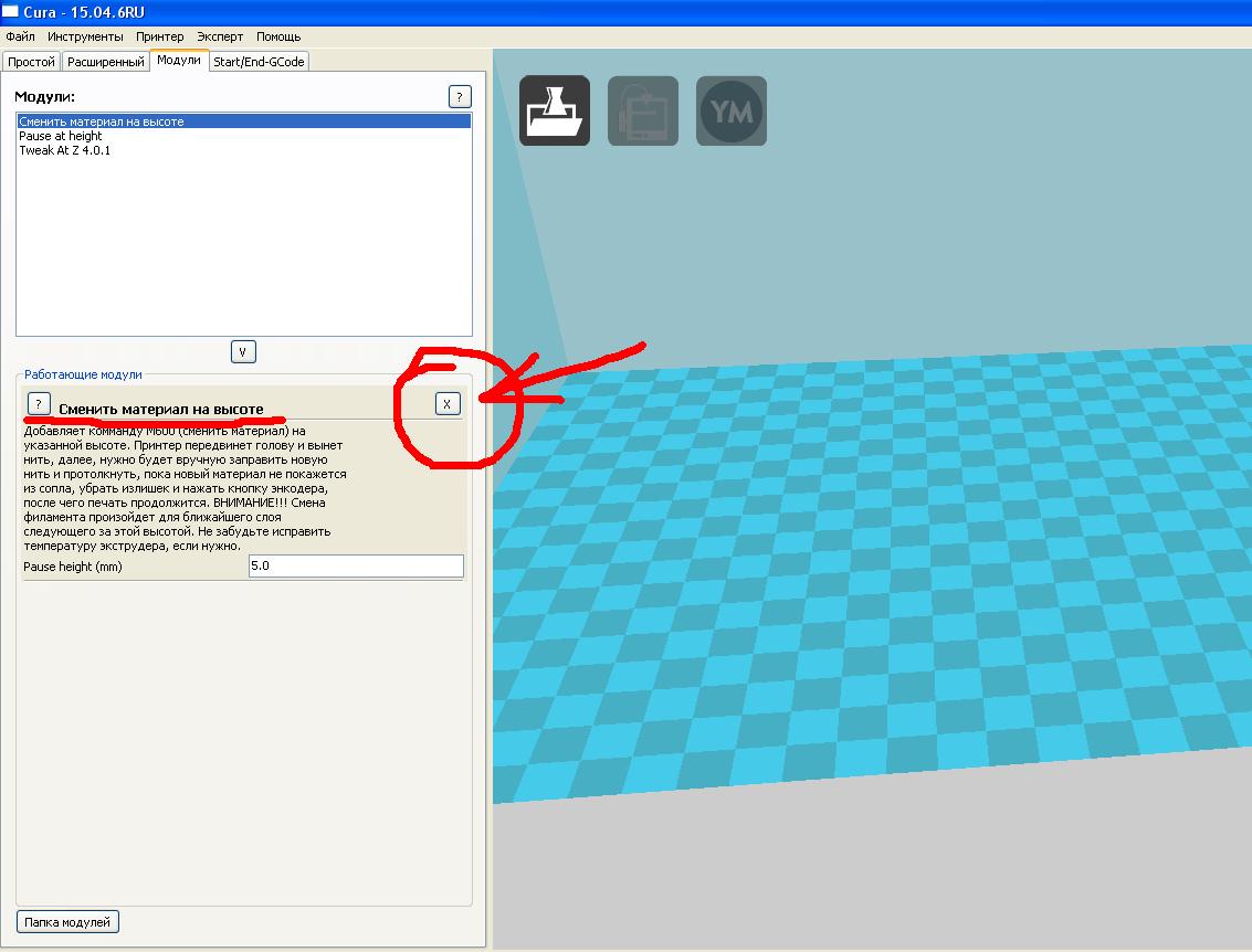 Закройте модуль смены филамента во вкладке "модули" ("расширения").
