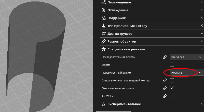 это не совсем косяк, вы используете режимы печати которые вообще не обязаны друг с другом работать.Respectable писал(а): ↑07 июл 2022, 15:44если печатать в режиме “поверхность” cura как косячила так и косячит.