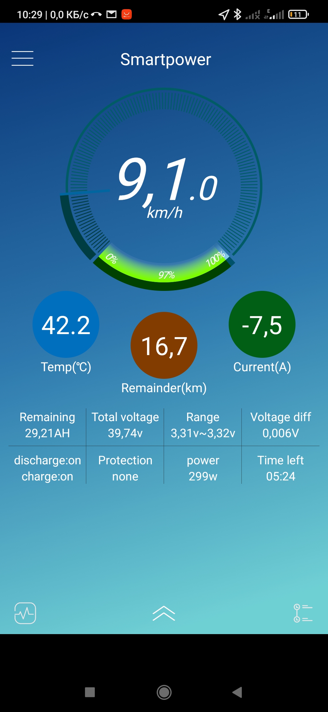 Не знаю, что бы я без неё делал - не надо ни ваттметра, ни GPS-спидометра. Все в одном приложении на одном экране смартфона. Контроль баланса ячеек, зарядных и разрядных токов, изменение ограничений на лету. Стоит каждого рубля (хотя по началу жаба душила).