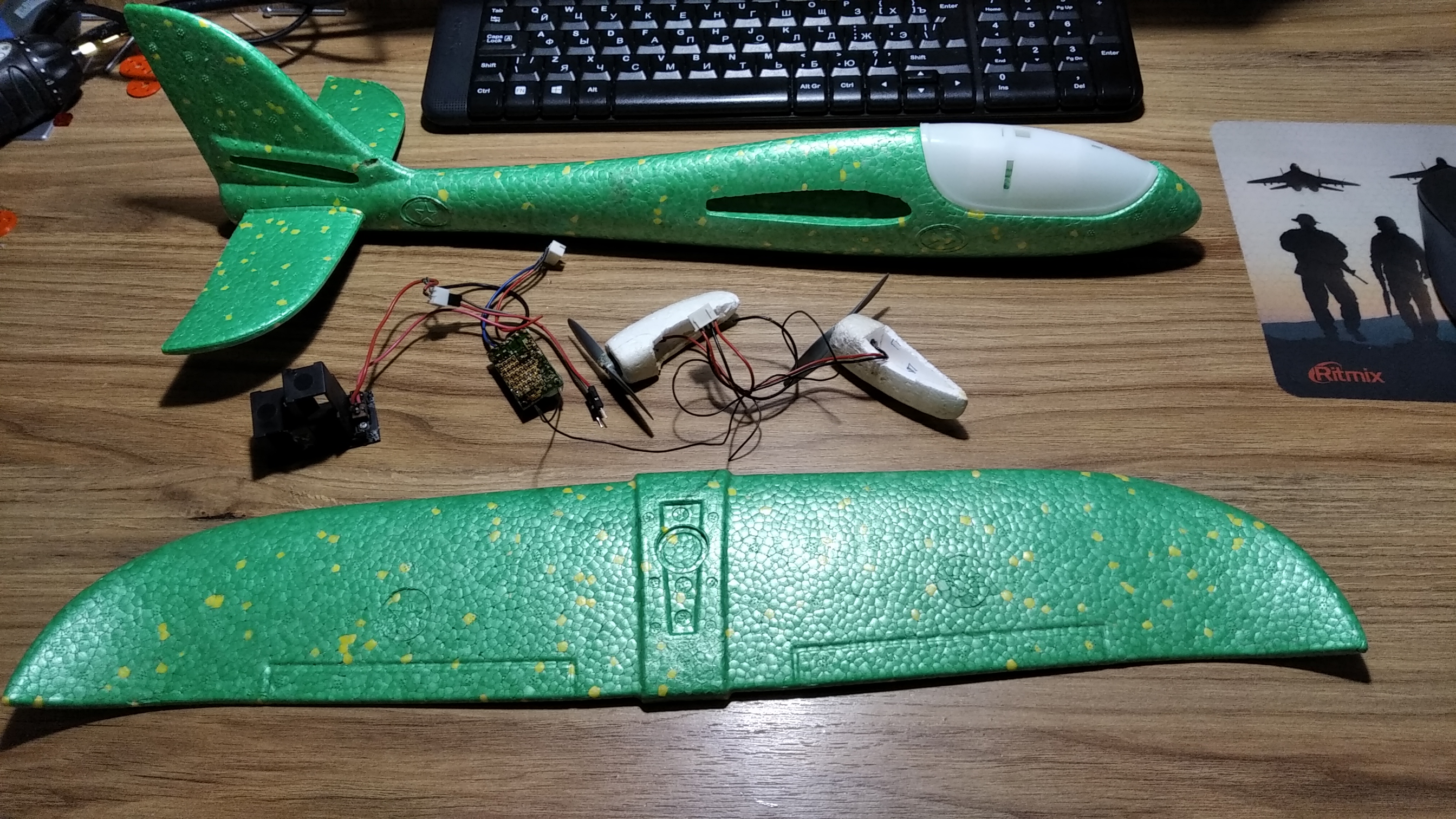 А для красиво и неспешно полетать на высоте - ещё позапрошлым летом была мысль сделать гибрид из китайского метательного планера, когда-то купленного младшему, и остатков простенького пенопластового радиоуправляемого самолётика, оставшегося от детства старшего, и валяющегося по коробкам с моим электронным хламом уже более 15 лет. Точнее остались от того самолётика все детали кроме крыльев и фюзеляжа. Два коллекторных моторчика в пенопластовых гондолах и с пропеллерами, аккумуляторный отсек, приёмник, пульт управления.