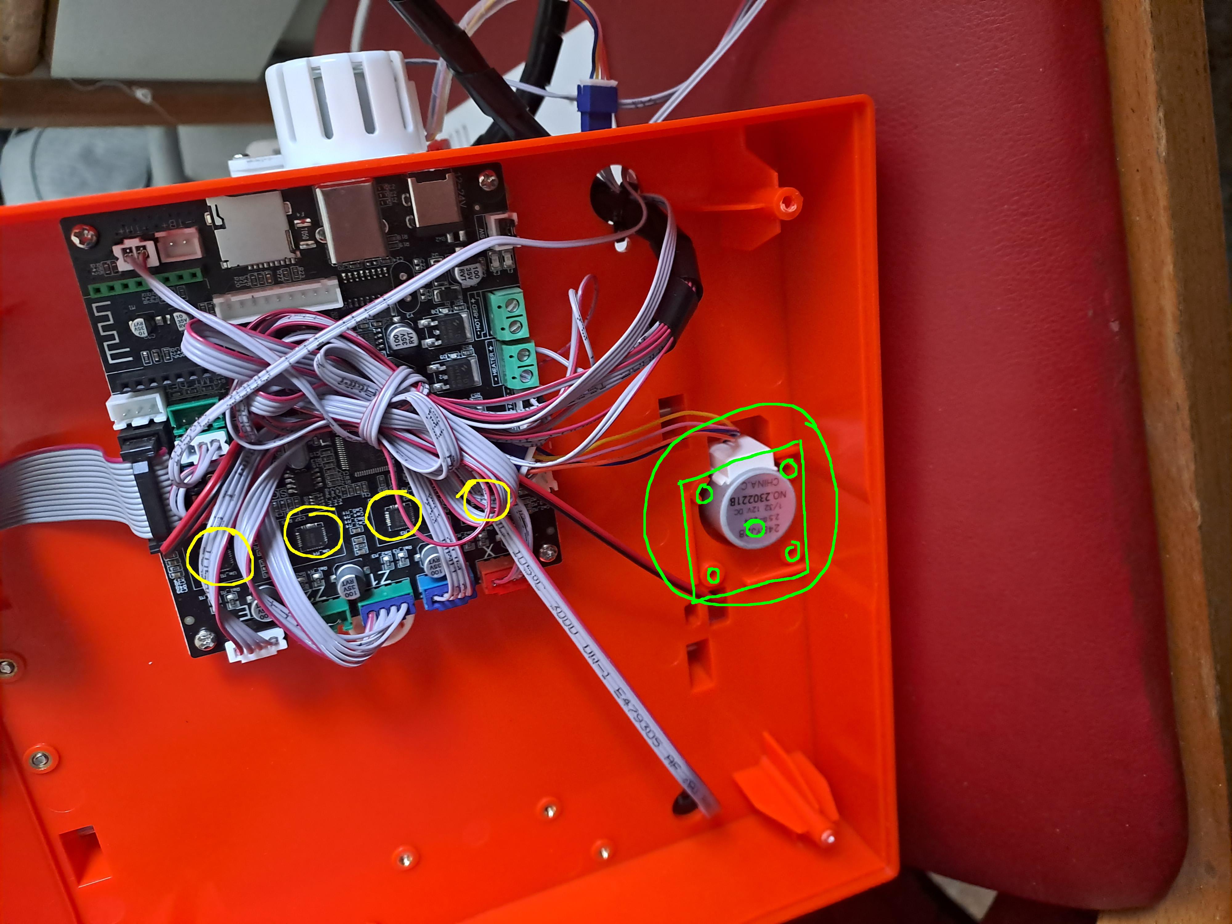 Зелёным обведён мотор оси У и выштамповка с отверстиями для крепежа под Нема-17, у которого вал точно по центру. А у стоящего там сейчас 24BYJ28 вал смещён, и это видно даже по фото. Смотрите на раположение отверстий крепления по углам квадрата, и место в центре квадрата, где будет вал Нема-17.