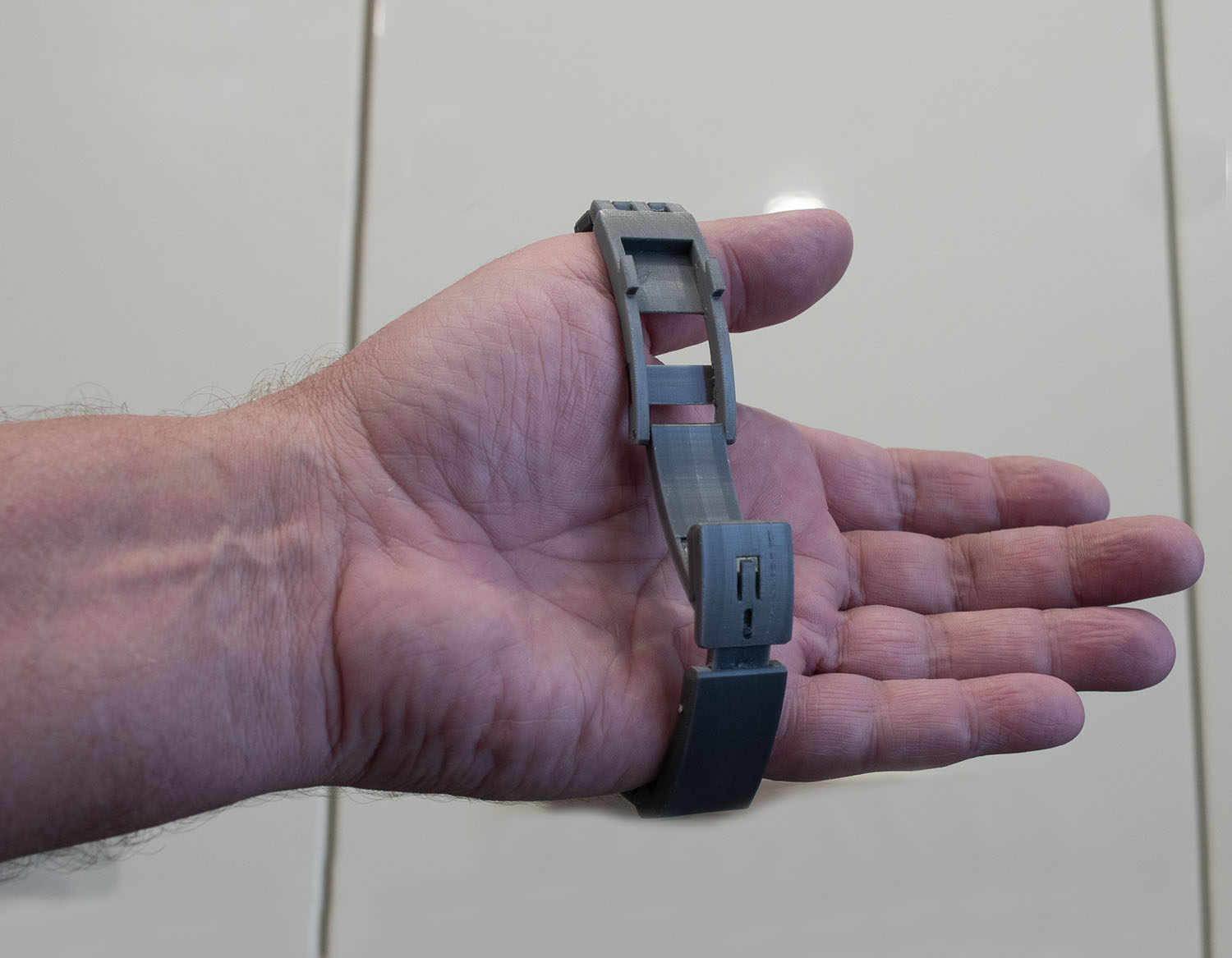 Замок состоял всего из 3-х печатных деталей: шарнирная раскладушка, отпечатанная print-in-place; защелка; регулировка длины. В соединениях замка применена 1 стальная шпилька. Замок был очень технологичен, но неудобно сидел на руке - был слишком длинным в сложенном состоянии и слишком коротким в разложенном. В ролике отчетливо видно, что браслет тесноват, надевается на руку "со скрипом".