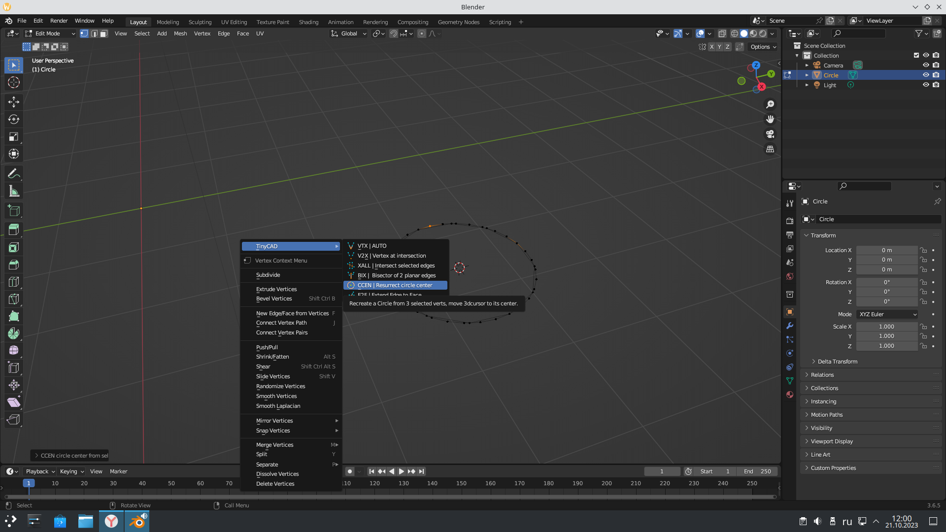 tinyCAD есть еще плагин (идет в комплекте с blenderom). по трем точкам ищет центр отверстия, ставит туда курсор и создает окружность.