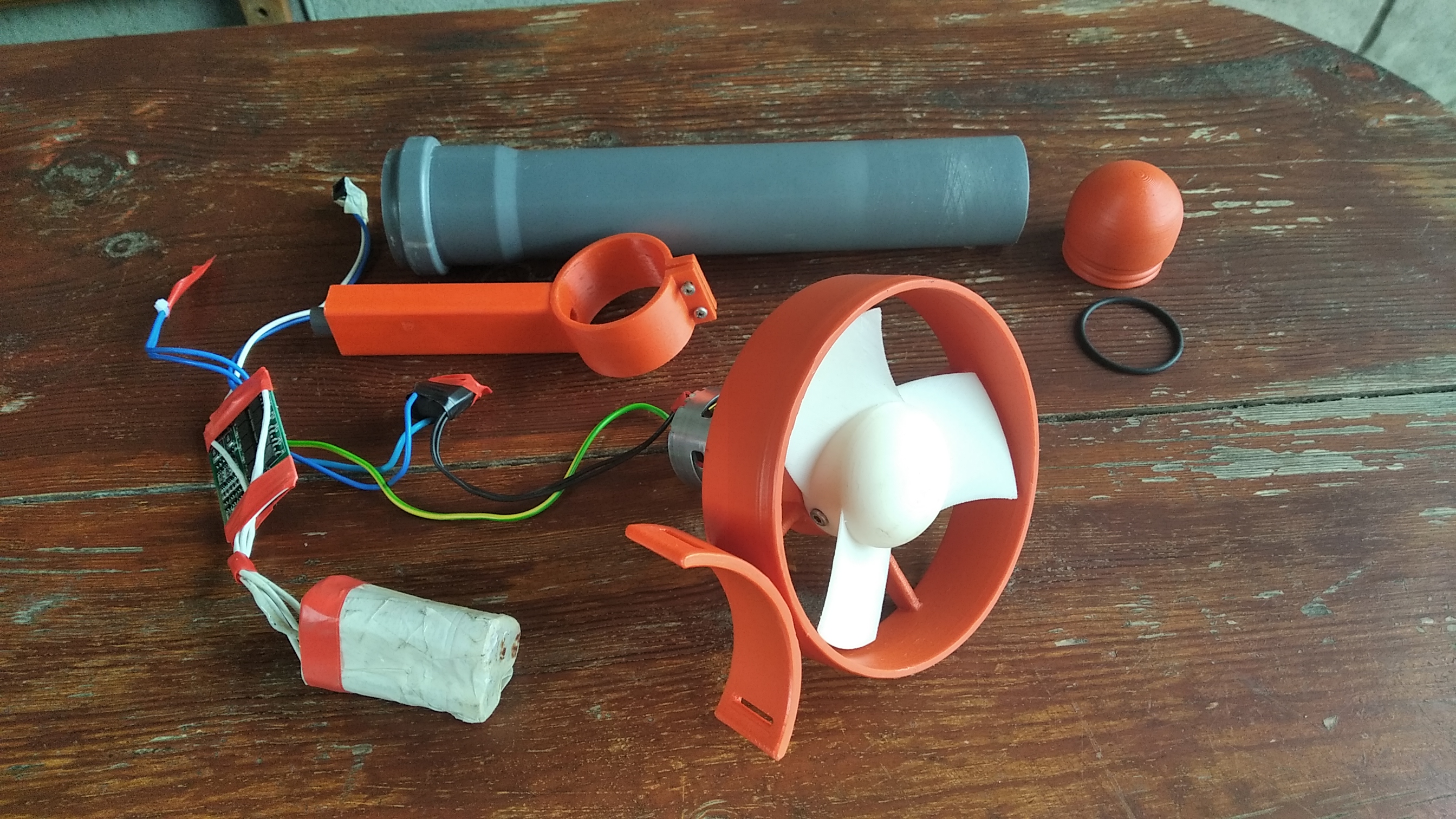 775-й мотор на 12 вольт и 3000 об/мин. (должен был работать на ЧПУ-фрезере, но в итоге туда пошёл мотор на 12 тыс.оборотов.), кусок канализационной трубы Ф50мм, три высокотоковые банки 18650, плата BMS на 30А.