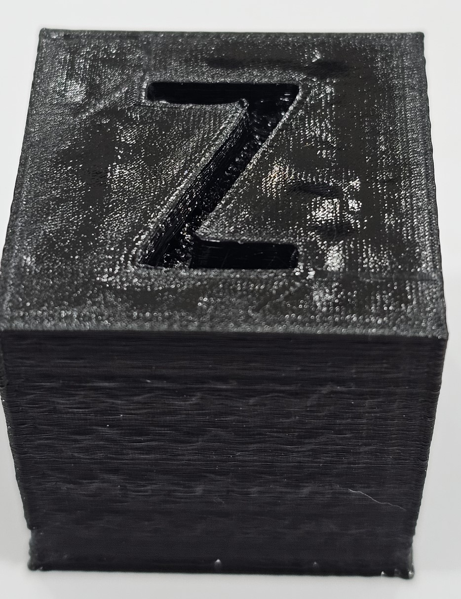 на стороне Х плюс ко всему еще и явный эффект эхо. на стороне Y буква смазана. сторона Z, сама буква вроде нормально пропечаталась, но поверхость последнего слоя как будто провалена в некоторых местах, там я кстати добавил в слайсере эффект разглаживания последнего слоя (типа как утюгом) без подачи пластика....