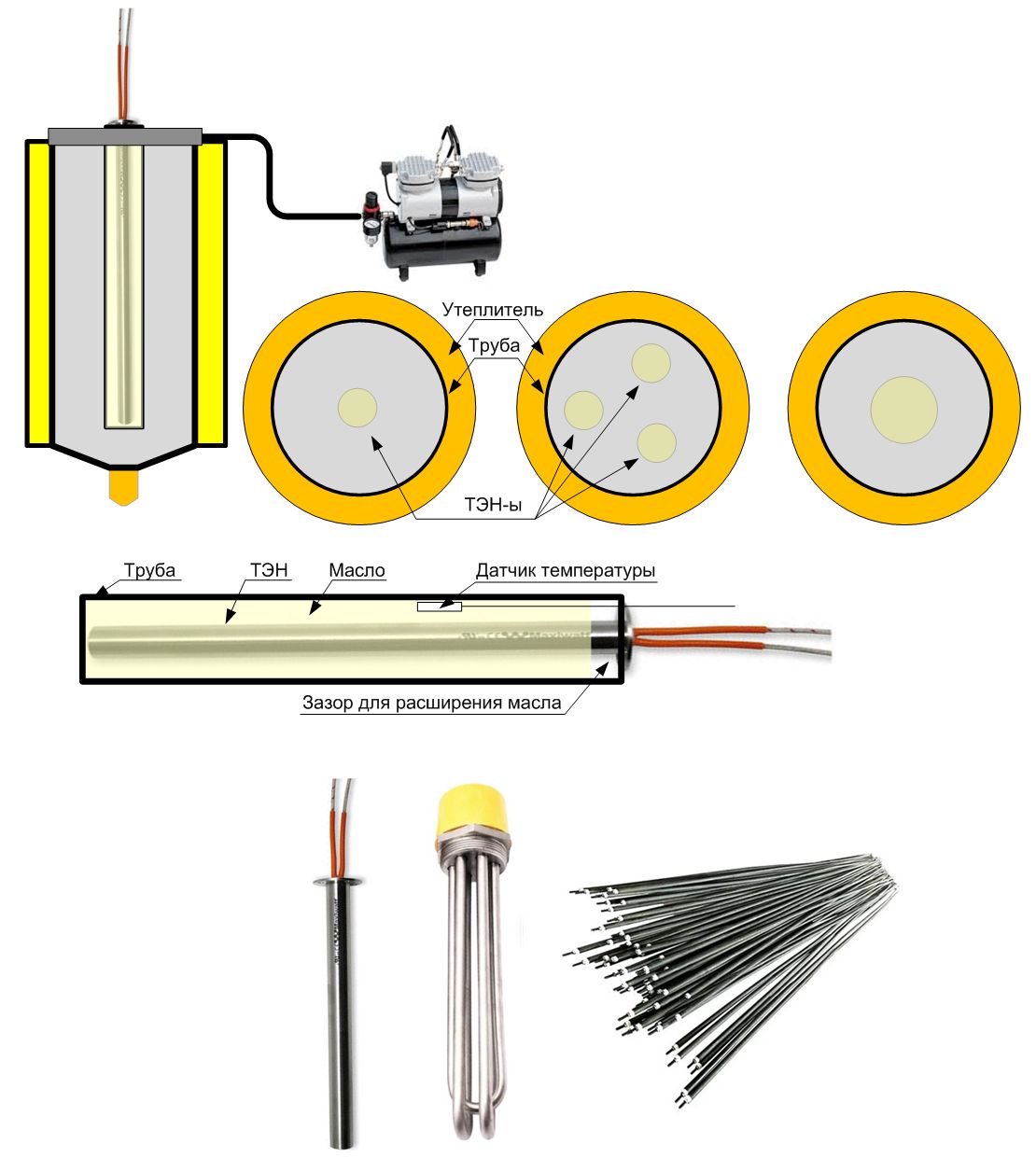 В качестве нагревателя в таком маслянном нагревателе используется ТЭН карандашного типа, как в самом низу рисунка.