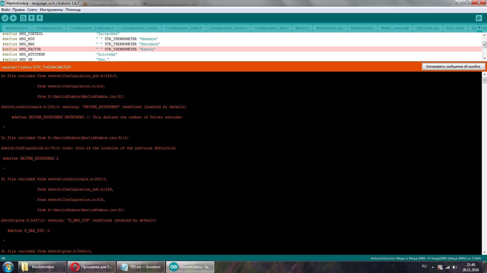 А вот с заливкой Marlin Kimbra - проблема. Скачал, открыл в ардуино, нажал проверить и ... одни ошибки. Создал прошивку через онлайн калькулятор и здесь все тоже самое. Стал жанглировать разными версиями ардуино 1.0.6, 1.6.7, 1.613, а ошибки все равно появляются и при этом разные.