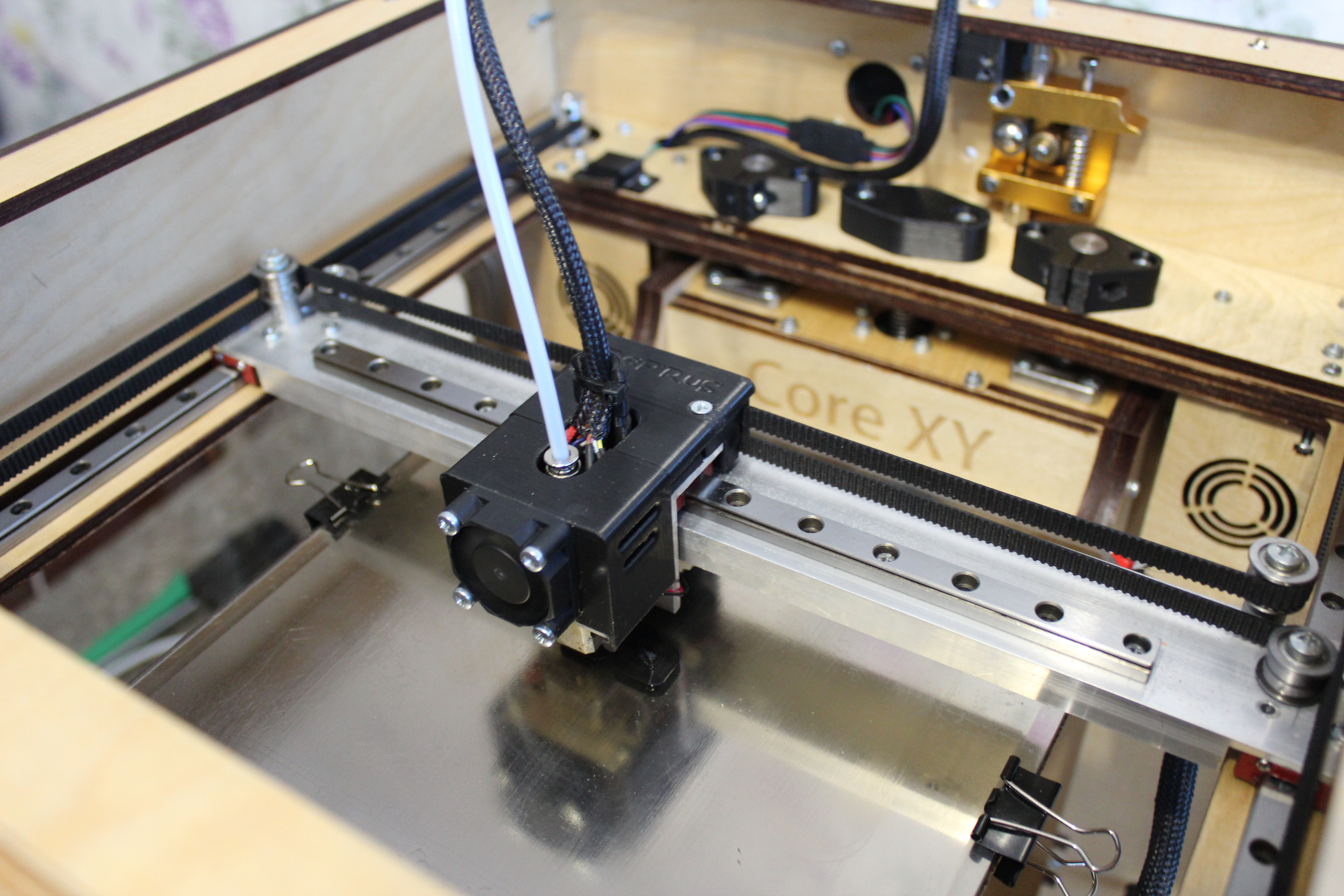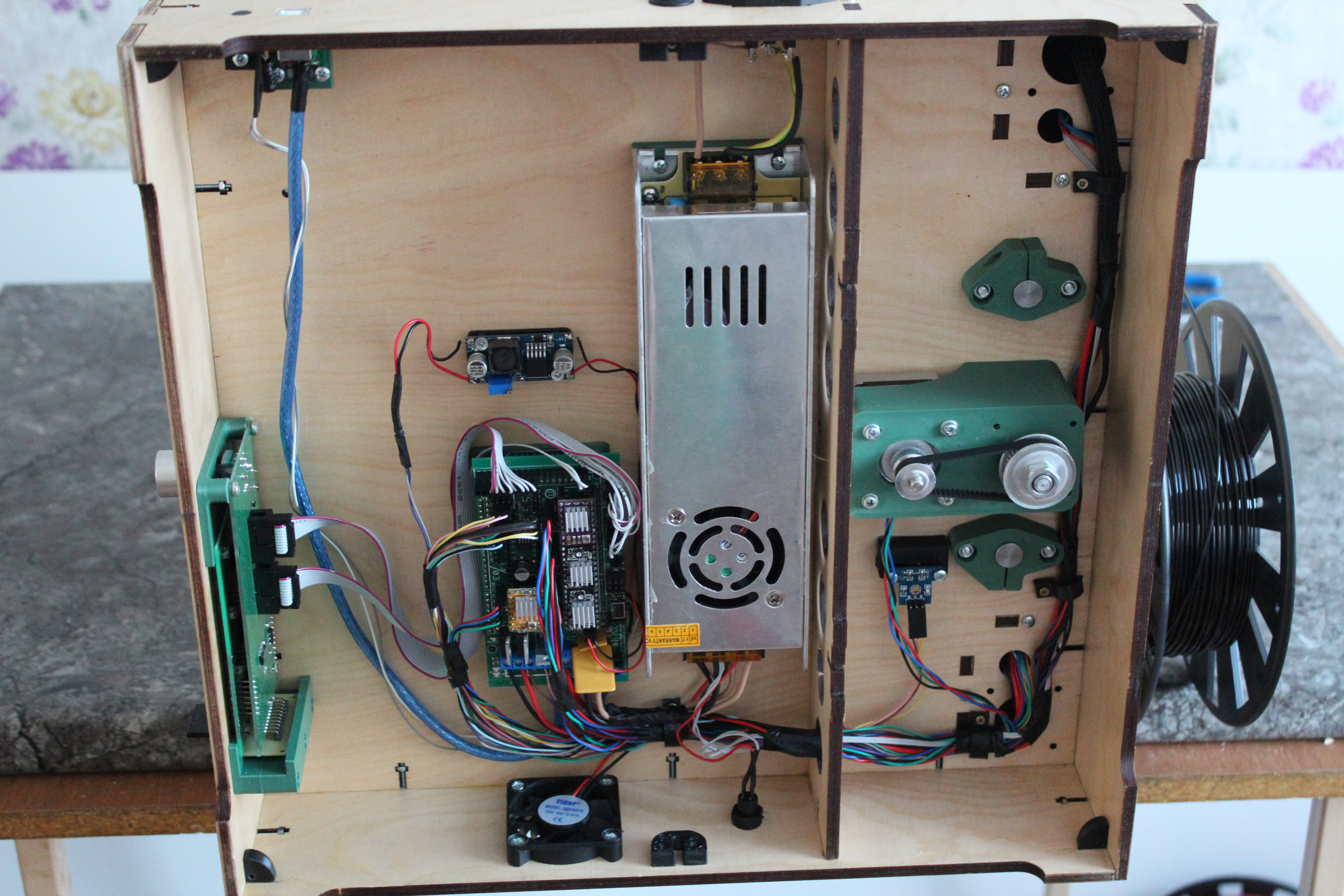 В совокупности фанера + стекло, дали ряд положительных качеств, таких как снижение шума, вибраций и высокая жесткость конструкции и основное это термокамера которая дает возможность получать напечатанные изделия высокого качества с хорошей спайкой в слоях, еще есть ряд материалов таких как ABS и Neylon для которых термокамера просто необходима,