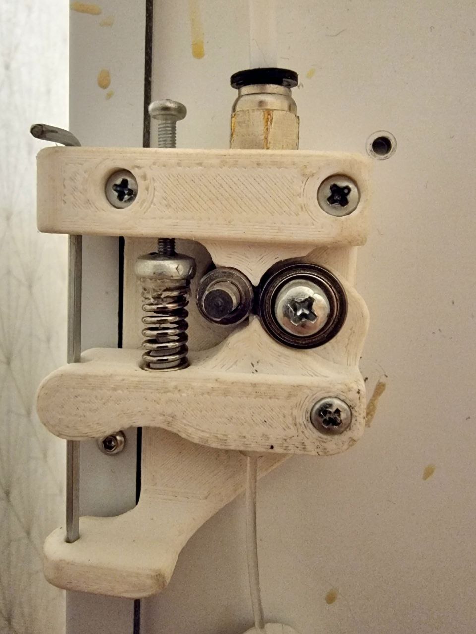 Фишка в точном повторении профиля шестерни и полной выборке пустого пространства, а также в дополнительной жесткой оси-направляющей рычага. В стандартной версии 1 точка крнпления из-за чего рычаг выворачивает вперед, нарушая геометрию прижатия, а в дальнейшем он просто трескается. Тут это невозмонжо, т.к. рычаг закреплен на 2х точках, это позволяет создавать большие усилия прижима без деформации.