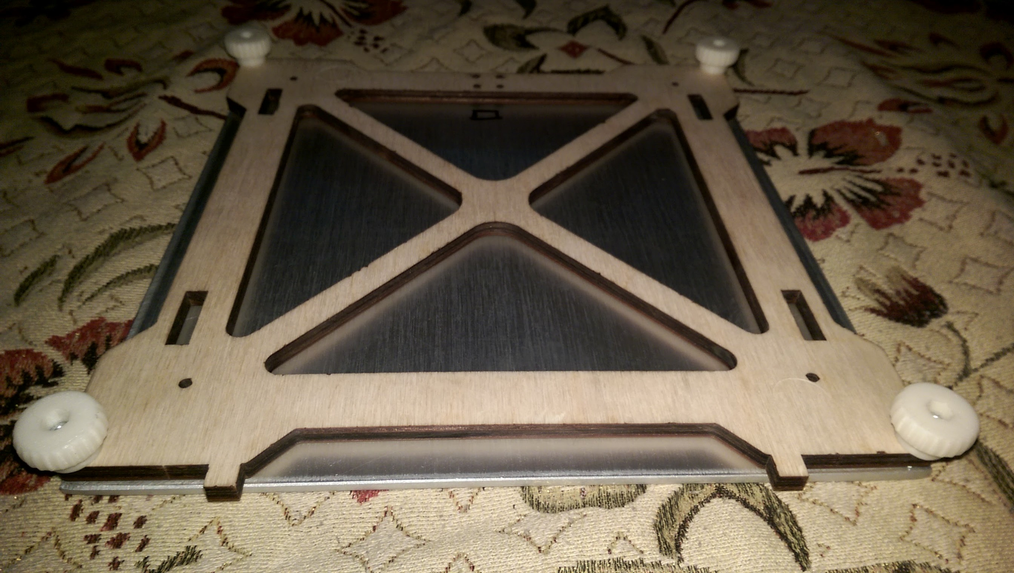 Вот стол наполовину готов. Винтики надо подлиннее, между алюминиевой плитой и деревянным основанием еще будет грелка и термоизоляция, а сверху стекло или зеркало. Ну и пружинки (кружинки как у меня сын в детстве их называл) ессественно.