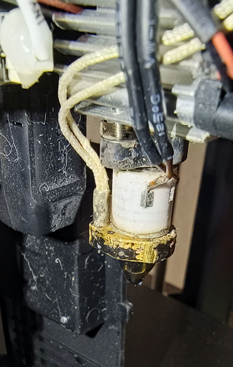 Заметил, что если установить температуру пониже (<180 градусов), то она доходит этого (?) значения, и процесс вроде как стабилизируется. Но при 180 уже начинает попахивать пластиком, он начинает течь, причем как из отверстия сопла, так и из резьбы (недавно заменил сопло), на рисунке видно, что течет сверху: Если температуру установить еще выше, то нагреватель начинает дымиться, пластик кипит.